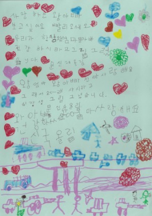 2012_08_27_2062_Shinle%20Shinguk%20Shinsu 愛するワンアッパ会いたいです。早く帰って来てください。私たちがいつもワンオンマ、ワンアッパが健康であるようにと絵を描いています。ワンオンマ、ワンアッパ、本当に愛しています。だから長生きしてくれるように十長生の絵を描きました。ワンアッパ、健康でいてください。ワンオンマ、愛しています。 信國(國進様家庭) 2012.09.10