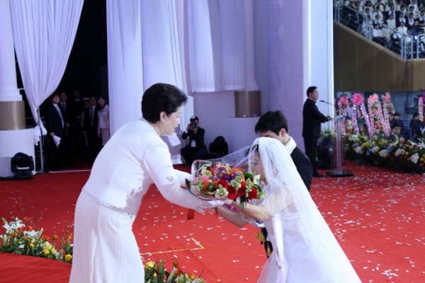 この日、善男善女の祝福家庭たちの拍手喝采を受けて入場した真の父母様は聖水の儀式を執り行うた。真の父母様による成婚問答で、「あなたは天の父母様の創造理想を完成する善男善女として、永遠の夫婦の縁を結んで、天地人真の父母様が立てられた伝統を受け継いで、天一国が目指す理想家庭を完成することを約束しますか?」と聞くと、参加した新郎新婦は真の愛を中心とした真の家庭に参入することに喜びの決意を込めて「はい」と力強く歓声で答えた。