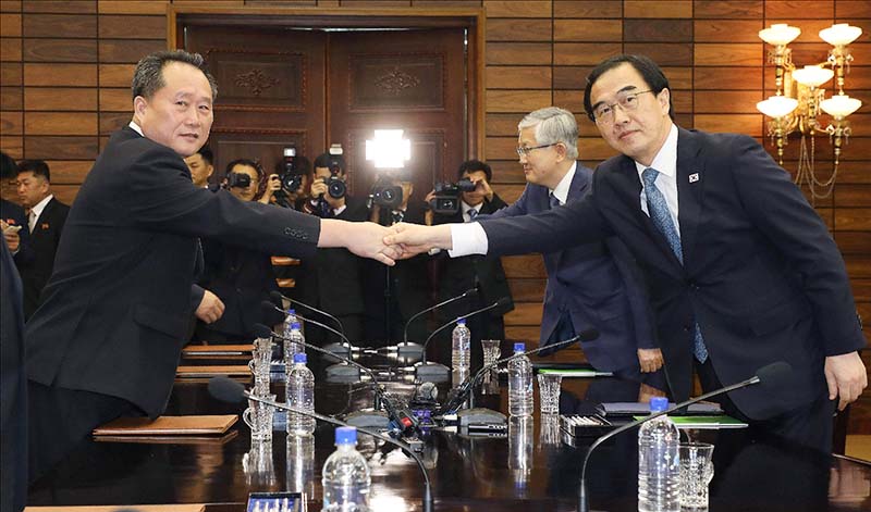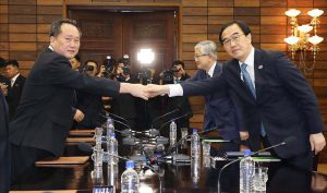 13日、板門店の北朝鮮側施設「統一閣」で開かれた南北閣僚級会談で握手する北朝鮮の李善権・祖国平和統一委員会委員長(左)と韓国の趙明均統一相(AFP時事)