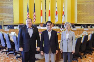 ポンペオ米国務長官(左)と河野太郎外相(中央)、韓国の康京和外相=2018年7月、東京(EPA時事)